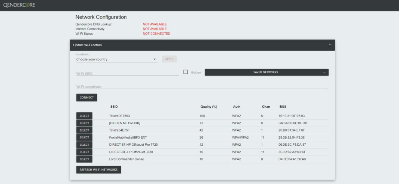 4. Once connected, use your preferred Web Browser (Chrome, Edge, Safari, etc), and navigate to http://qendercore.local OR 192.168.89.89. You will be directed to the page below: